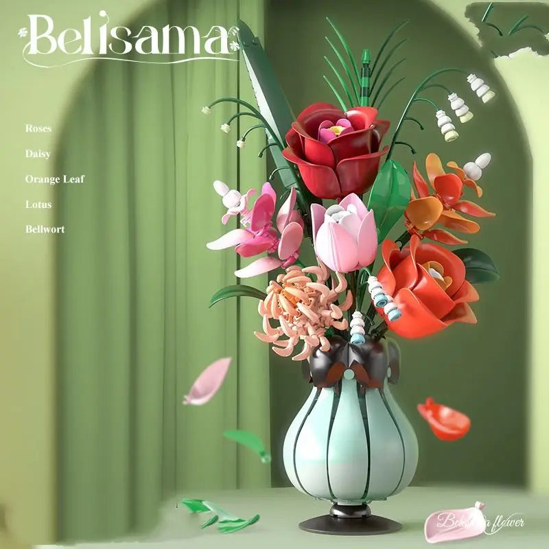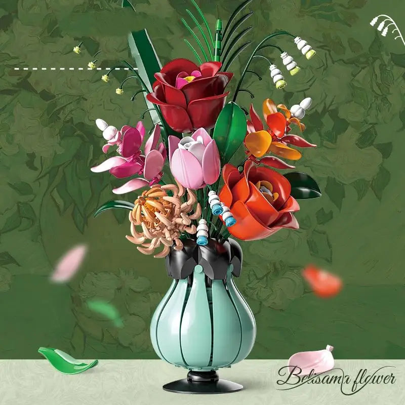 566 Piece Building Blocks Set Assembles Into A Timeless Mixed Bouquet With Roses Tulips Daisies Features Realistic Blooms In Red Pink White Blue And Orange Leaves For Rich Visual Depth Displayed In A Textured Light Blue Vase With Black Base For Stable Elegant Shelf Presentation