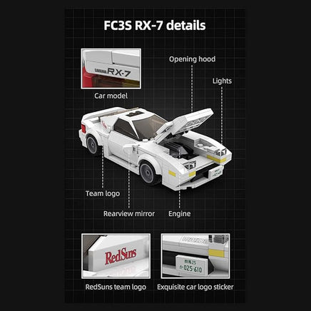 CaDA's Mazda RX-7 FC-35 building kit is licensed by manga rights holders and car makers. This 1:24 scale model boasts superior car building blocks with an opening hood, detailed engine bay, and interior, and comes with a RedSuns team logo sticker. great collectible and gift for fans of manga and racing cars.