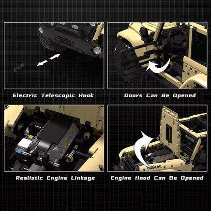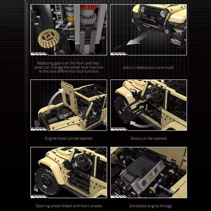 Composed of over 3,600 individual parts, this model intricately mimics the appearance and structure of a real off-road vehicle. What sets this model apart is its unique pneumatic-operated differential control. Simply toggle the three switches located in the trunk, and watch as the pneumatics engage or disengage the model's three differentials. This innovative feature enhances the off-road experience by ensuring optimal traction across various terrains.