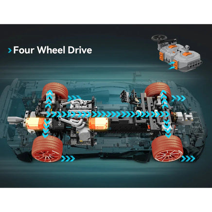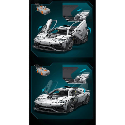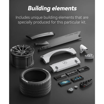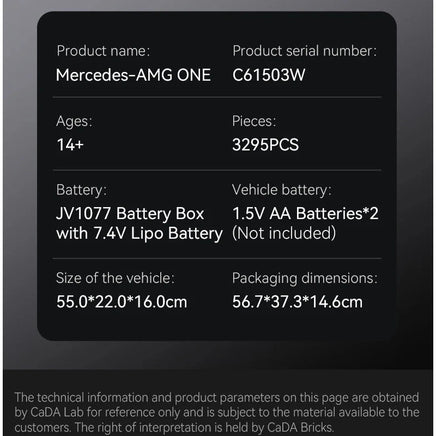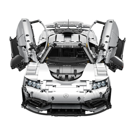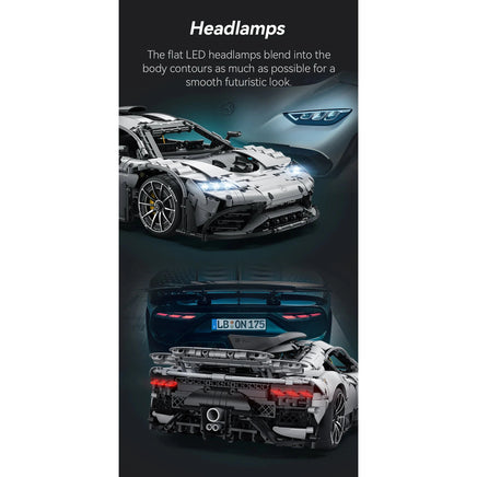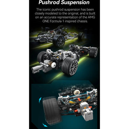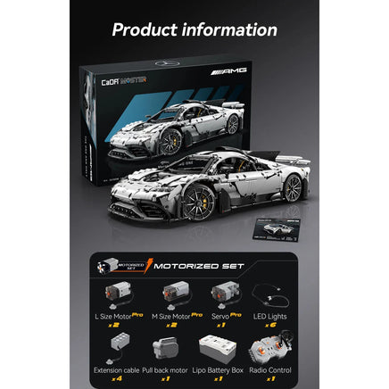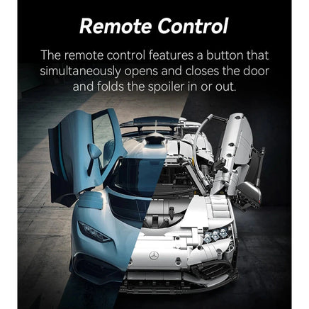 Mercedes-AMG ONE C61503W adopts a unique and innovative "ejection start" gameplay that is unprecedented in bricks products. At the same time, the vehicle series functions and gameplay are restored, including: equipped with dual-motor four-wheel drive for strong power, remote control of butterfly wing door opening and closing linked to tail wing lifting, remote control vehicle steering linked to F1-style rectangular steering wheel, rear V6 engine linked to remote operation, remote control of front and rear 6 Each lighting group forms a matrix eye of the soul, and all four wheels are equipped with independent suspension shock absorbers.